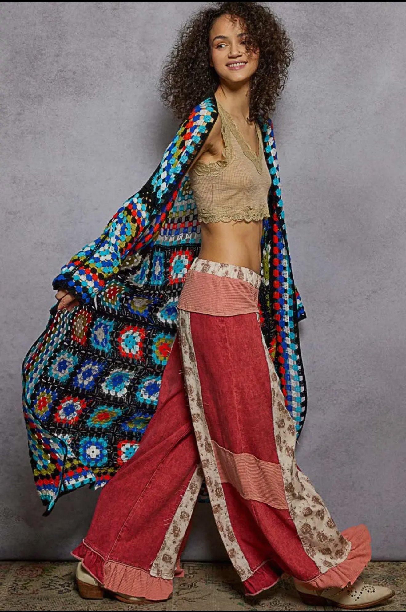 Designed in long sleeve roomy fit cardigan in crochet with various colors and weave knit patterns.